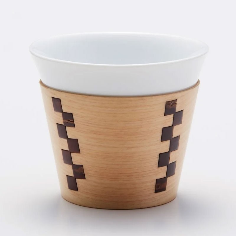 These cups are a part of the Tsunagu (tie) series, with a simple and modern design, and handles made of cypress that are nicely joined to a Mino-yaki porcelain center. Square and round cut-out patterns of cherry bark are arranged nicely on the surface of the cypress wood, showing a beautiful contrast between the shades of the cypress and cherry bark along with the warm and soft feel of wood. Because these cups are not heat-conducive, you can comfortably handle it with hot drinks. These cups are washable, as they are fully coated.