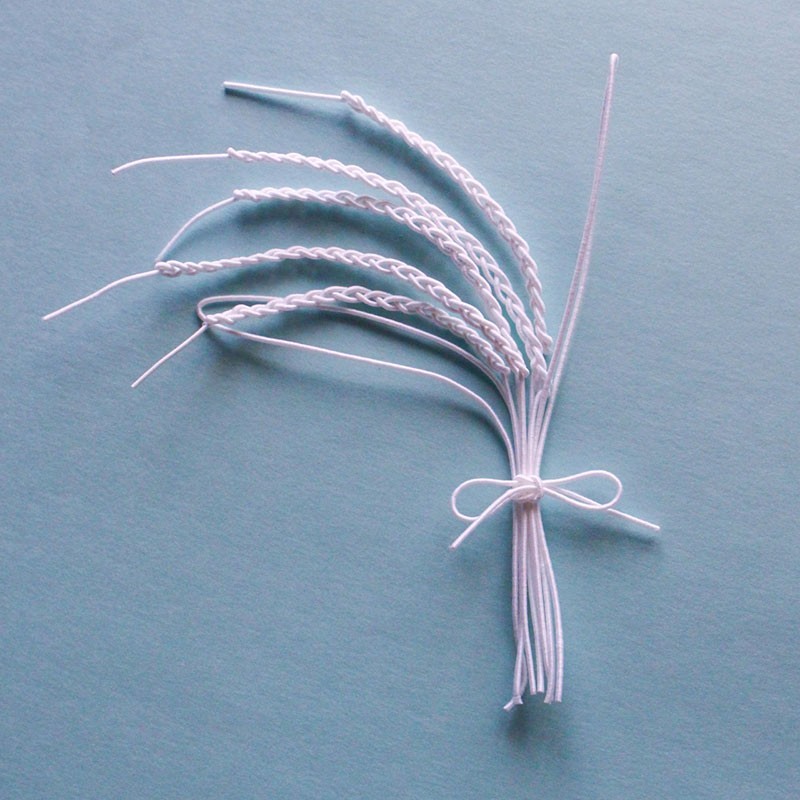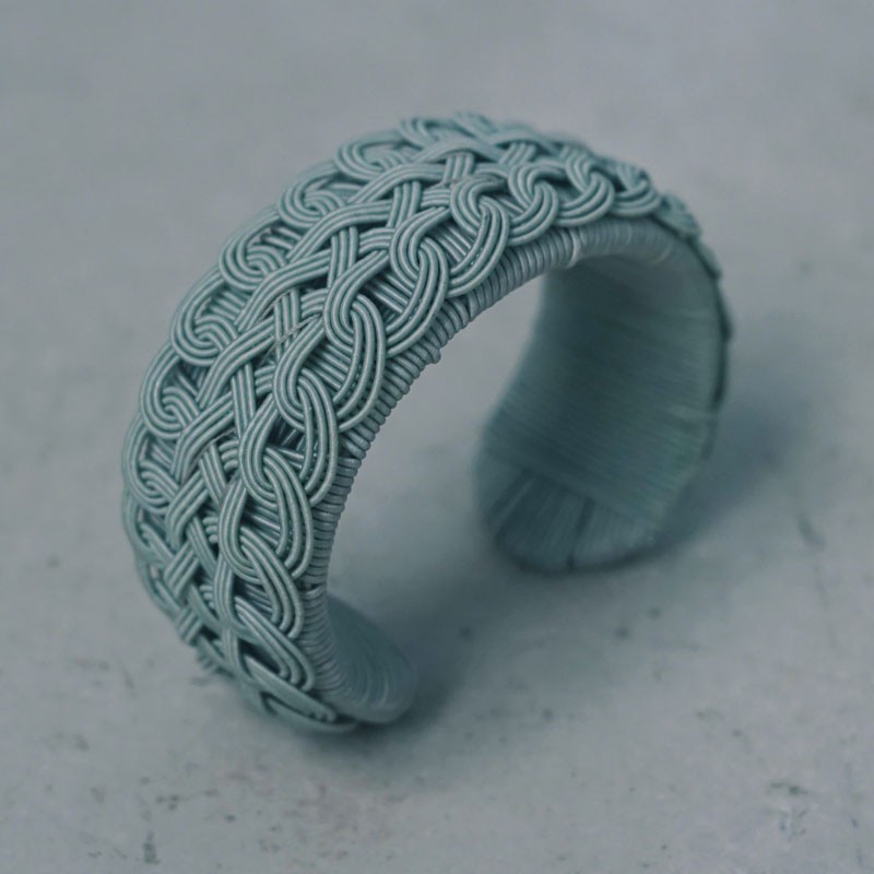 The long leaf motif of the knots, representing the “leaves” of the mizuhiki plant processing, is tied in very long strings, giving an impression of softness and looseness that neutralises the massiveness of the bracelet base.