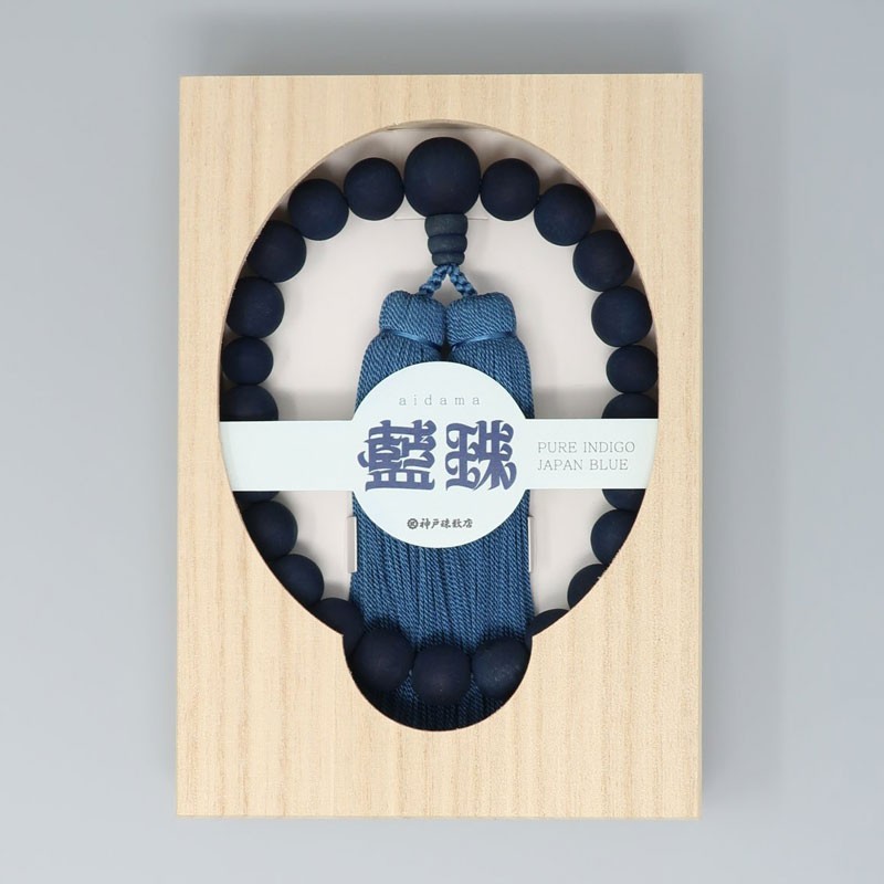 We have focused on creating rosaries using the traditional Japanese colour “indigo”. We use wooden beads and tassels dyed using the traditional method of “true indigo dyeing”, which employs no chemical substances whatsoever. This is an original rosary from Kobe Juzu, featuring an unprecedented commitment to the indigo hue.