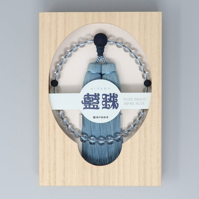We have focused on creating rosaries using the traditional Japanese colour “indigo”. We use wooden beads and tassels dyed using the traditional method of “true indigo dyeing”, which employs no chemical substances whatsoever. This is an original rosary from Kobe Juzu, featuring an unprecedented commitment to the indigo hue.