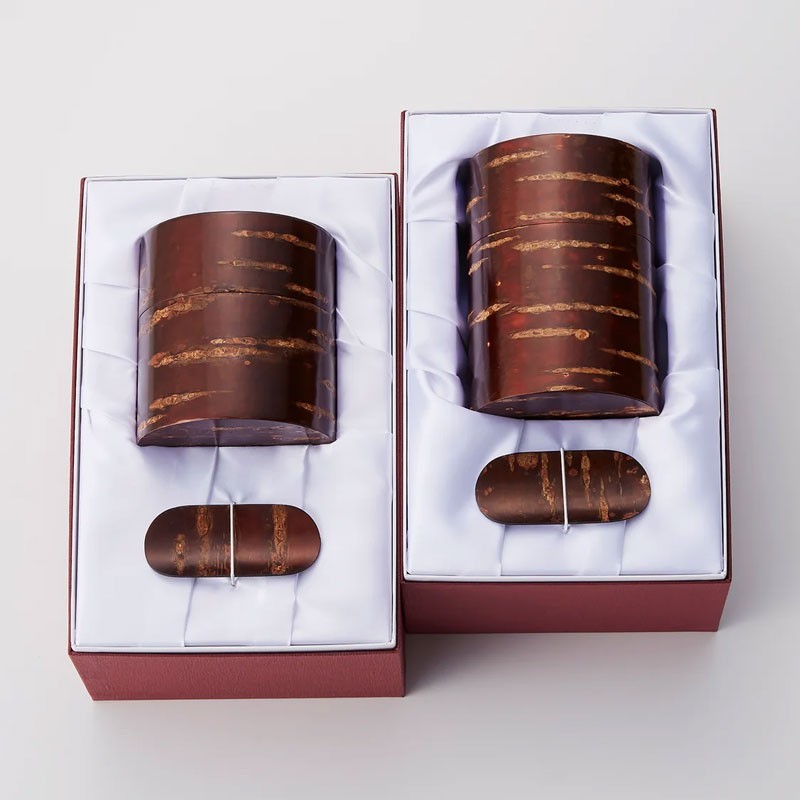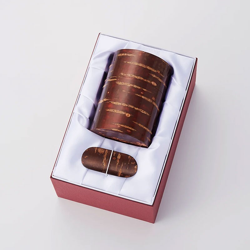 Questo set di porta tè e paletta è completamente rivestito di corteccia di ciliegio selvatico, kaba, sia all'interno che all'esterno del contenitore. La corteccia di ciliegio è stata essiccata a lungo, tagliata molto sottile e poi lucidata per conferire una bella lucentezza alla superficie che conferisce una caratteristica diversa a ciascun oggetto. La corteccia di ciliegio ha anche una buona capacità di ventilazione, di trattenere l'umidità e di essere antibatterica. Inoltre, questi cestini sono sigillati ermeticamente e sono adatti a conservare le delicate foglie di tè, a dimostrazione dell'attenta, esperta e sapiente lavorazione artigianale dei nostri Meister. La corteccia di ciliegio acquista una profonda ed eloquente lucentezza ambrata con il passare degli anni.