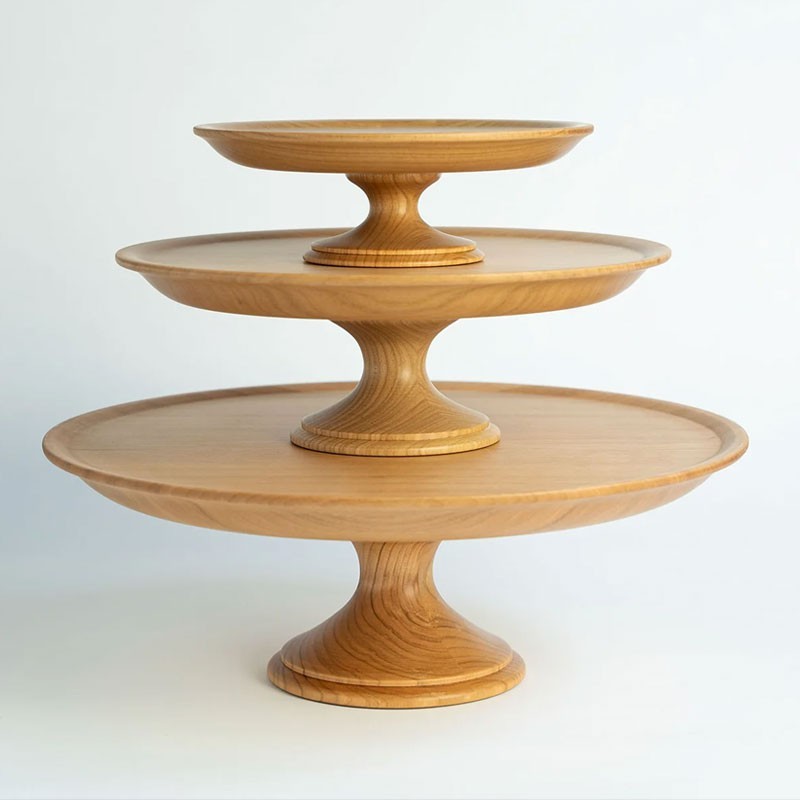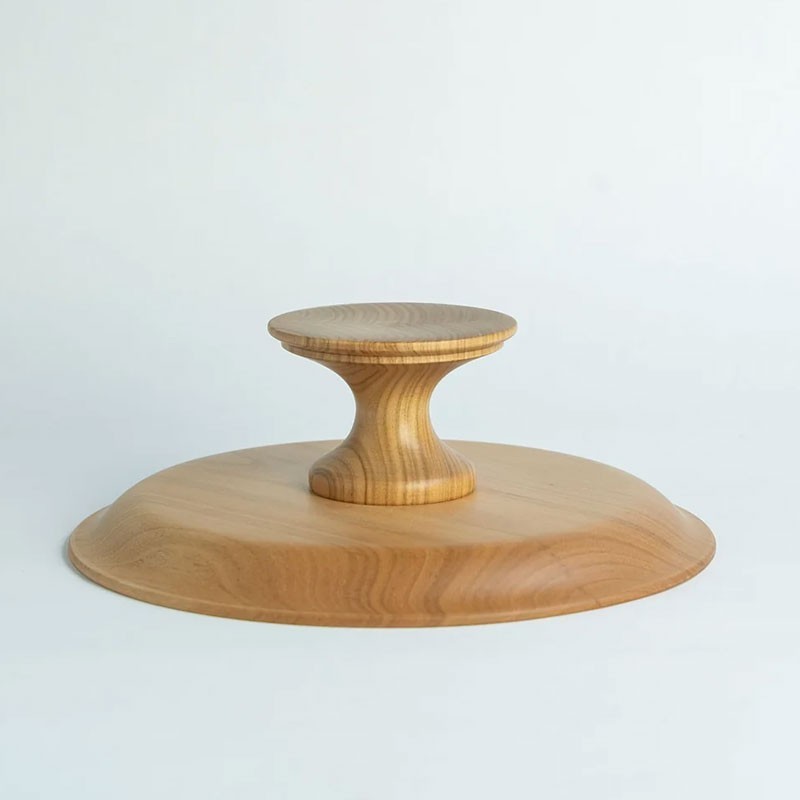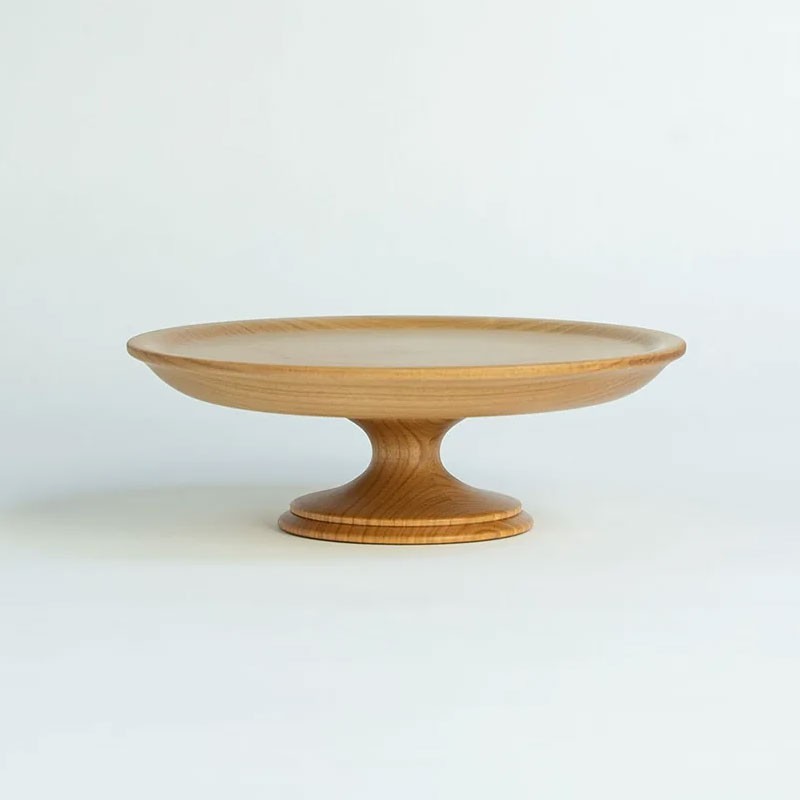 Alzata realizzata in legno di noce e di ciliegio, con rivestimento in poliuretano per alimenti: materiali e procedure sono conformi alla normativa giapponese per la realizzazione di prodotti che vengano a contatto con alimenti e persone. Rispetto al vetro o alla porcellana, i supporti per torte in legno sono leggeri, facili da tenere in mano e meno soggetti a rotture. La loro forma stabile li rende facili da maneggiare e, quando vi si posizionano torte e altri prodotti da forno, la loro forma semplice aggiunge un tocco di eleganza alla tavola. Sono consigliati anche per esporre accessori e piccoli oggetti.