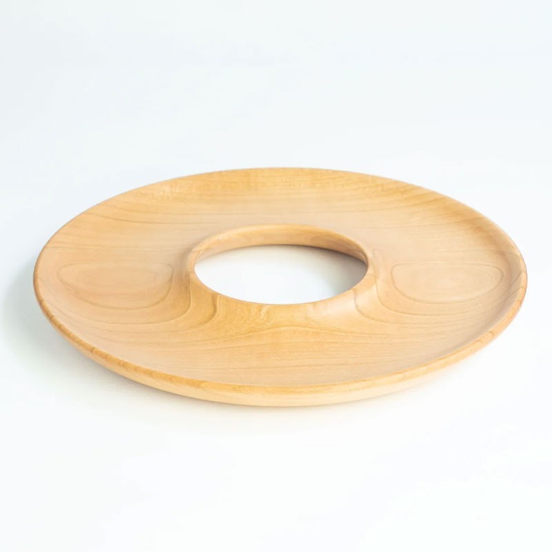 Piatto a forma di Bagel realizzato in legno di noce, di ciliegio e di acero, con rivestimento in poliuretano per stoviglie: materiali e procedure sono conformi alla normativa giapponese per la realizzazione di prodotti che vengano a contatto con alimenti e persone. I bicchieri Kami Glass M e L si inseriscono perfettamente al centro del piatto, consentendo di trasportarli insieme. Comodo per eventi all'aperto e feste in piedi.