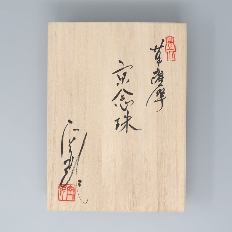L'artigiana tradizionale Kūjo, specializzata in Kyō-yaki e Kiyomizu-yaki, ha riportato in auge le tecniche del Kyō-Satsuma in modo del tutto personale, creando il nuovo “Hana Satsuma”. Si tratta di una ceramica delicata ma splendidamente lussuosa. Il motivo “Fondo nero con decorazioni dorate” presenta motivi floreali colorati in oro su sfondo nero. Questo design combina un'impressione chic con un senso di solennità, evocando l'immagine di una donna sofisticata ma dalla forte volontà.