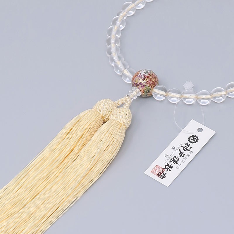 L'artigiana di ceramiche in stile Kyoto, Ono Kunyo ha riportato in auge le tecniche tradizionali della ceramica Satsuma di Kyoto in modo unico e personale, creando il nuovo stile “Hana Satsuma”. Questo stile è stato incorporato in questi rosari. Caratterizzati da delicati e intricati disegni floreali, questi “Rosari Ono kunio Hana Satsuma Kyoto” sono stati assemblati con cura dai produttori di rosari di Kyoto presso il Kobe Juzu