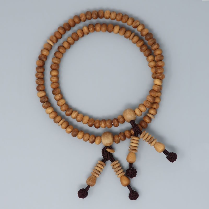 Realizzato con 108 grani di legno di sandalo, può anche essere indossato come amuleto. Con l'uso, sviluppa una lucentezza che permette di apprezzarne la consistenza e il colore mutevoli.
