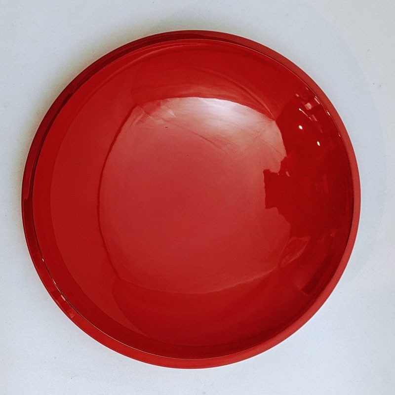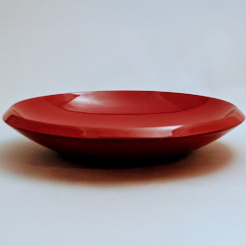 Questo recipiente, di colore rosso presenta una lucentezza di roiro, caratteristica della lacca.